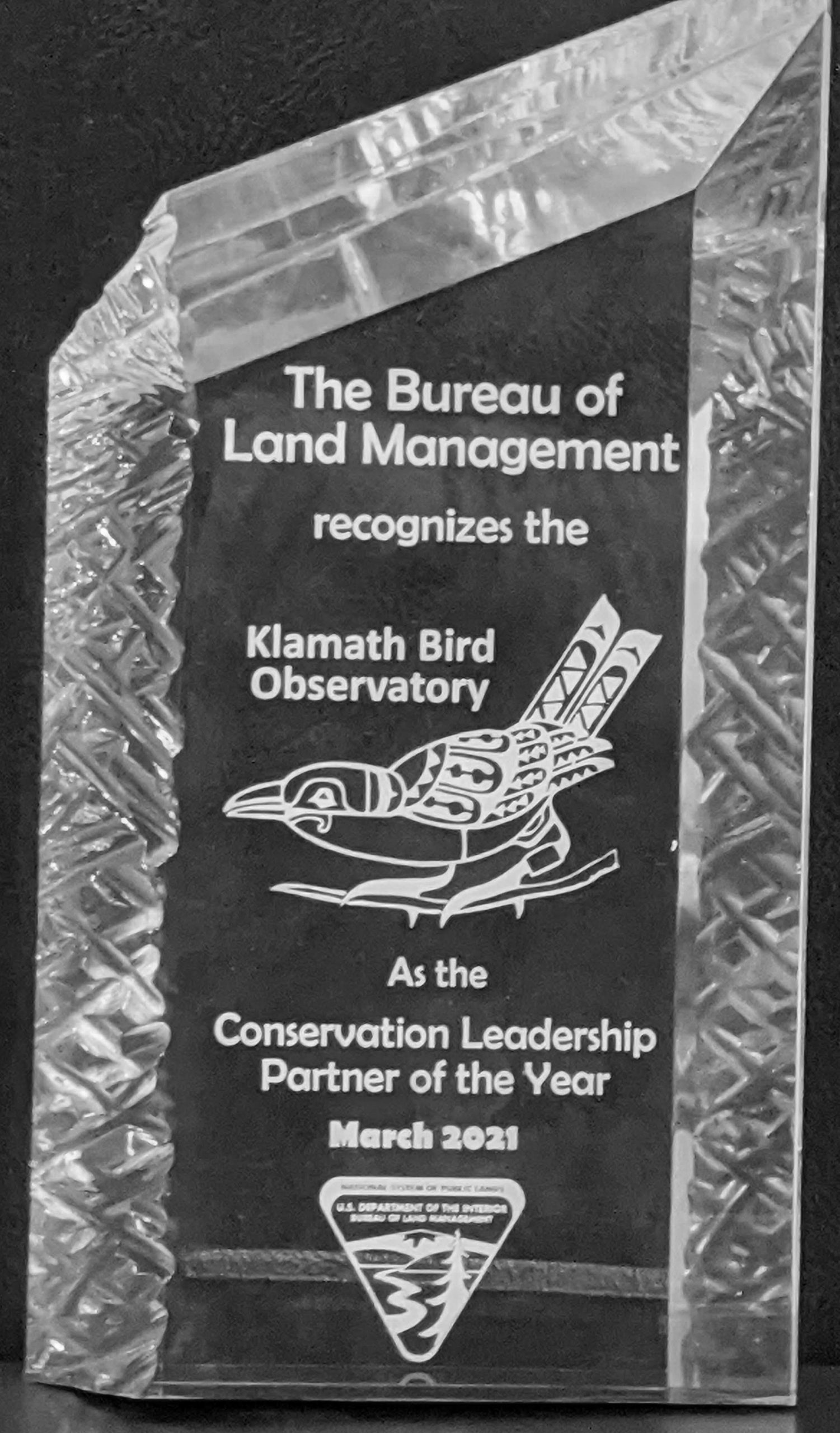 The Medford District BLM is pleased to nominate the Klamath Bird Observatory (KBO) for the BLM Conservation Partner Award. KBO has been our partner for over 20 years in which they have run a network of southwestern Oregon bird banding/monitoring stations including two stations for BLM (Medford and Lakeview Districts).