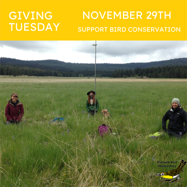 Join the Giving Tuesday movement. It is the biggest day of the year for generosity. By giving to Klamath Bird Observatory, you are helping to support long-term monitoring that provides information about changes in bird populations, in-depth theoretical research that advances our understanding of bird distribution and movements, and applied ecology that addresses natural resource management challenges. We ask that you help us with our continued efforts to protect birds, putting birds and KBO’s science at the forefront of conservation decision-making and action.
