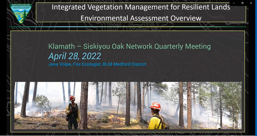 Klamath Siskiyou Oak Network is a collaborative regional partnership that works to conserve oak habitats on private and public lands in southern Oregon and northern California. This presentation’s speaker was Jena Volpe, a KSON steering committee member and Fire Ecologist with the Medford BLM. She discussed the Integrated Vegetation Management for Resilient Lands Environmental Assessment (IVM-RL EA), which creates a toolbox for the BLM to increase the scope, scale, and pace of proactive treatments over a 10 year period.